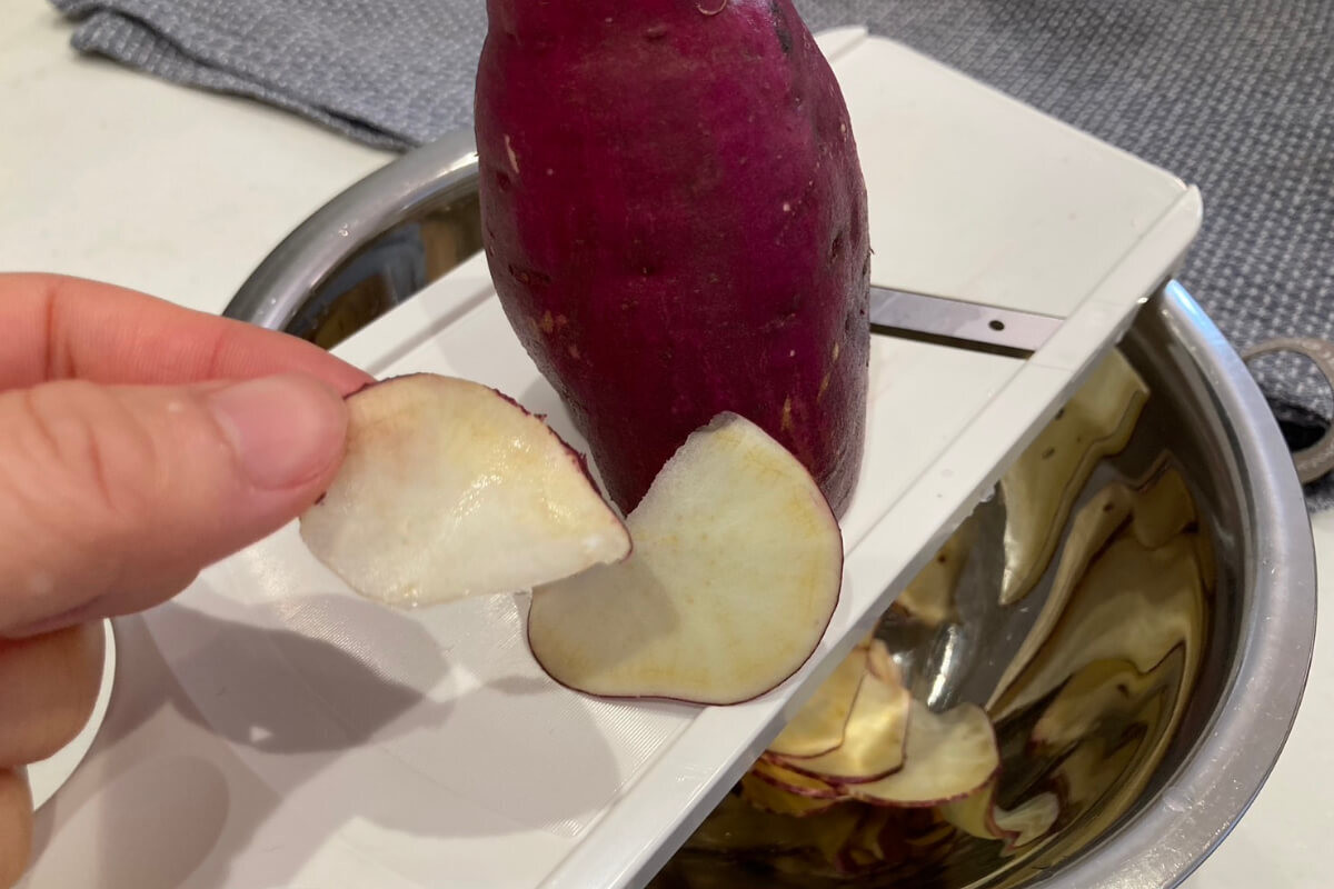 野菜チップスにハマっている娘のリクエストでさつまいもをスライス。