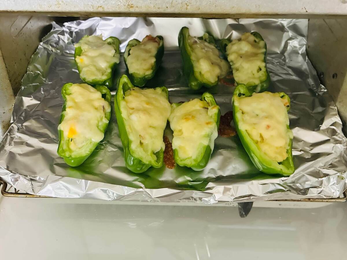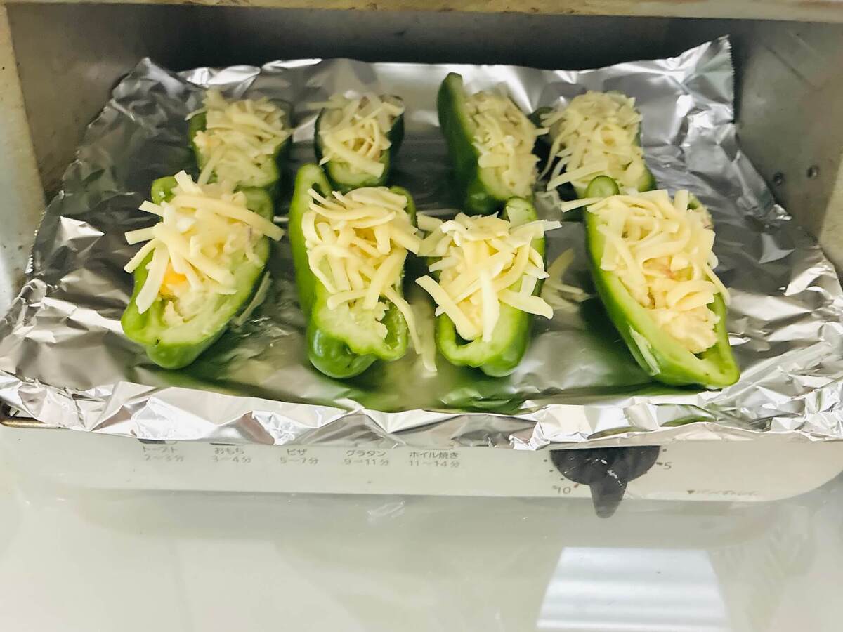 今回は、トースター1000Wで7分ほど加熱しました。まだピーマンがかたそうな場合は、しばらく庫内に放置しておくと余熱でやわらかくなりますよ♪