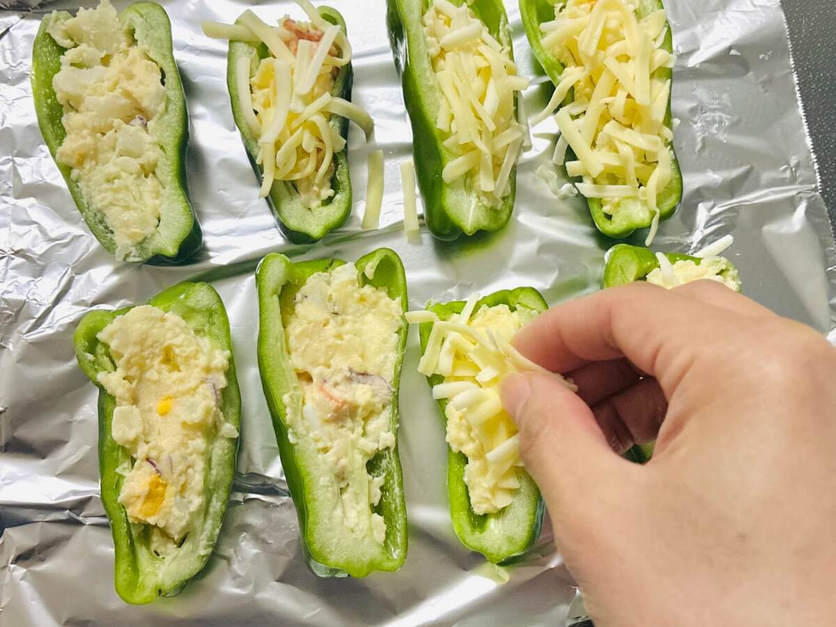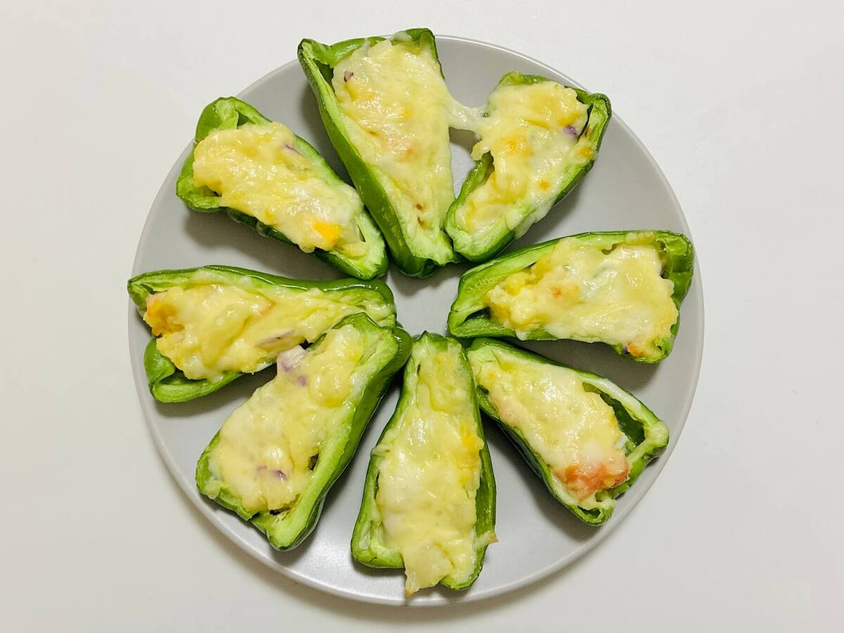 ※今回はピーマンは4個、ポテトサラダは150g、シュレッドチーズはふたつかみほど使用しました。