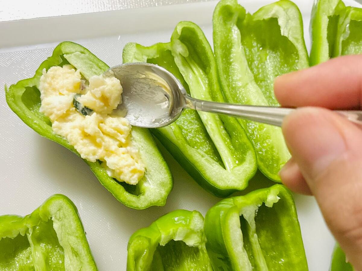 スプーンで市販のポテトサラダをピーマンに詰めます。