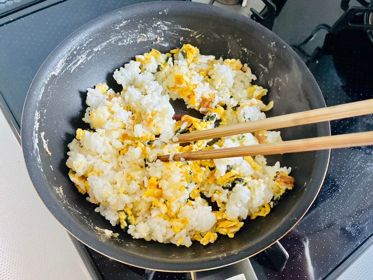 作り方③フライパンで①とごはんを炒める