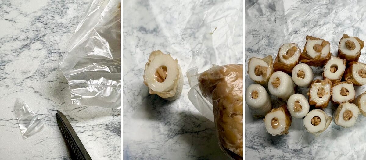作り方③ポリ袋の端をカットし、ちくわの穴に納豆を絞り出して詰める