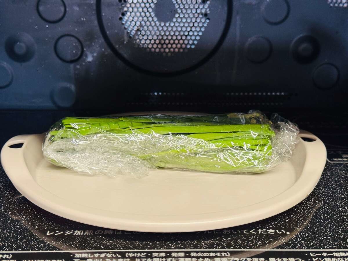 ラップで包んだニラを600Wの電子レンジで50秒温めましょう。