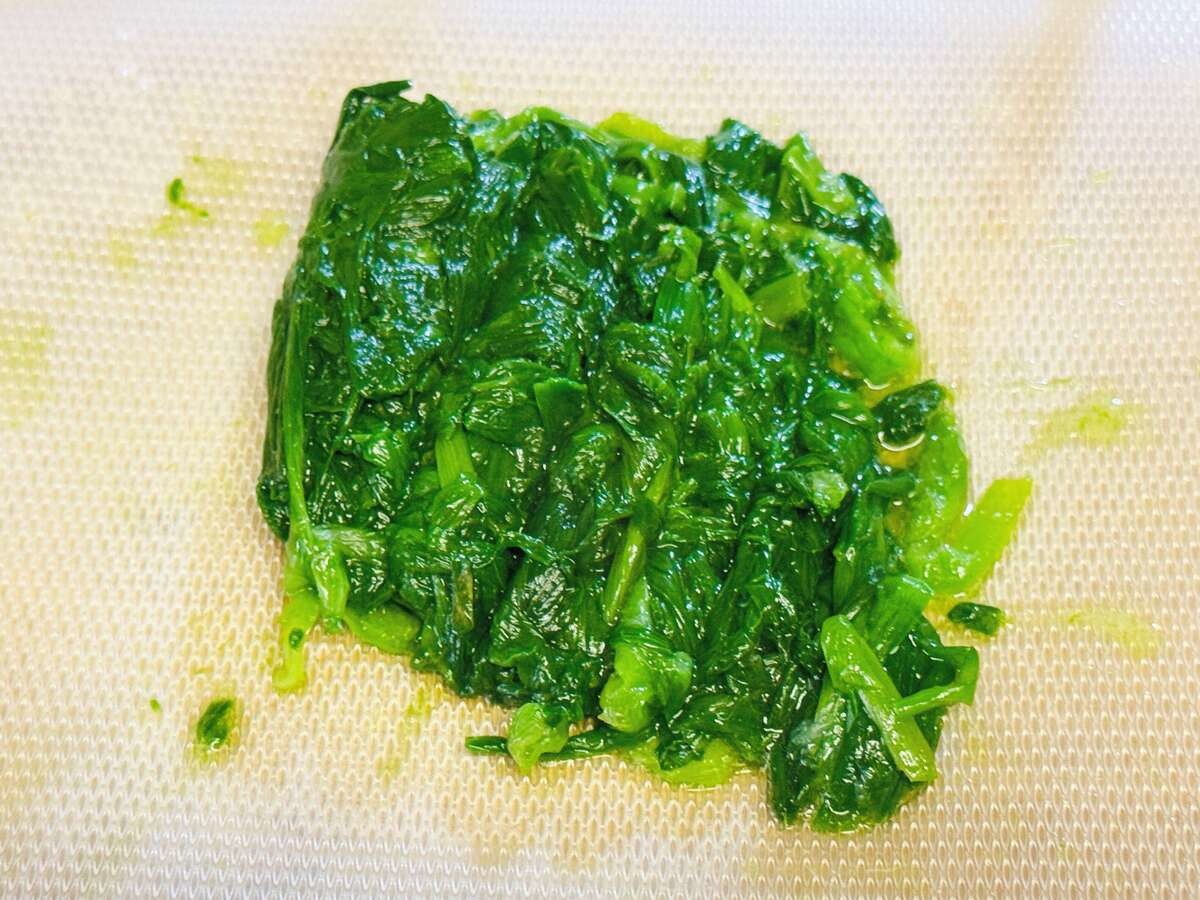 いったん水分を絞りニラを叩くようにしながら細かく刻みましょう。加熱したては熱いので火傷には注意してくださいね。元々カットしにくいイメージのニラですが、加熱されるとさらにカットしにくくなりますので、思ったよりもしっかりと叩くのがおすすめです。
