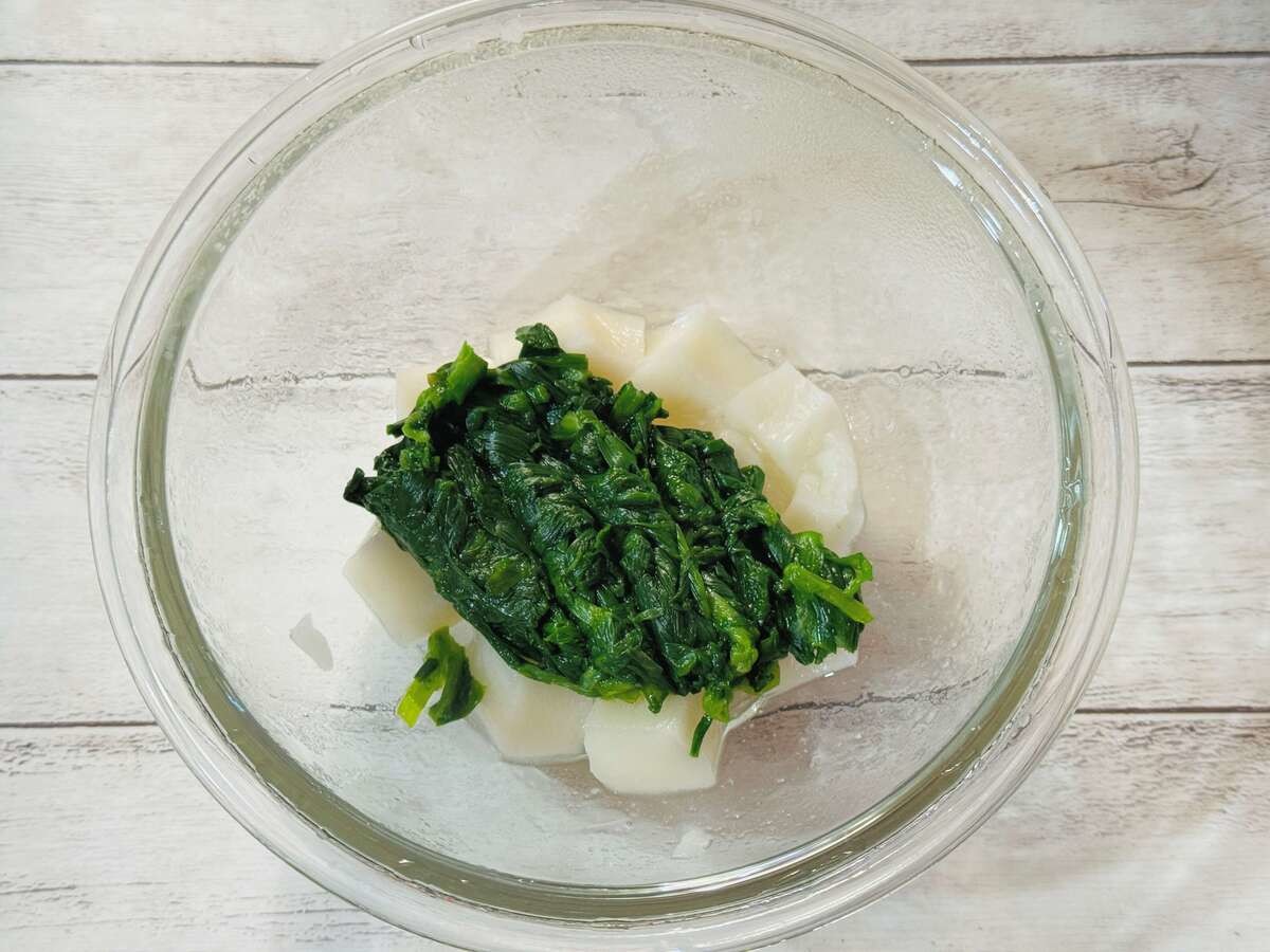 作り方【6】ニラと餅をよく混ぜる