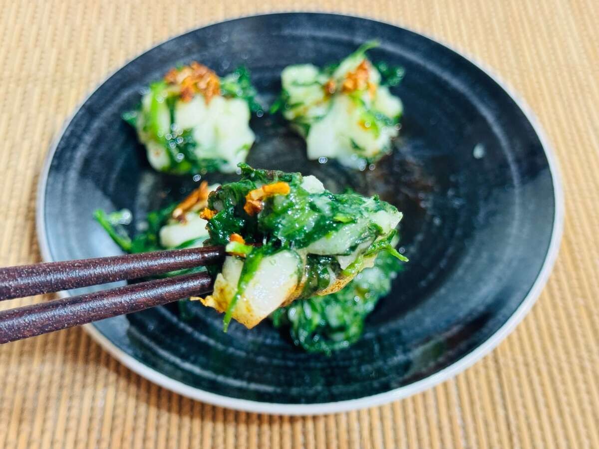 食感のコントラストが楽しい!ニラの鮮やかな緑が映えるお餅は、噛むたびにシャキッ、モチッとした楽しさが広がります。