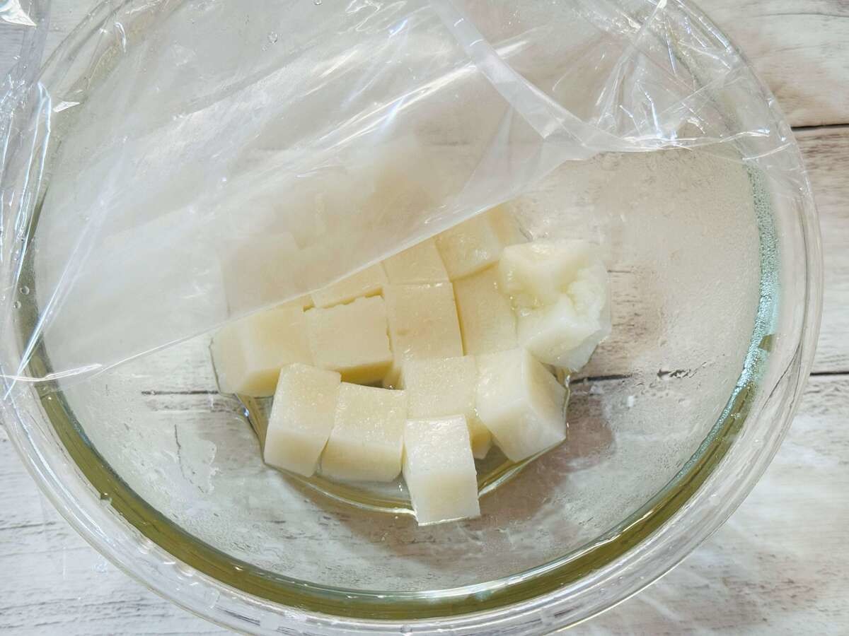 ④の餅を耐熱ボウルに入れたら砂糖と水を加えてラップをし、600Wの電子レンジで1分~1分20秒温めましょう。 冒頭にも触れましたが、砂糖を入れることでお餅の保水性を高め、冷めても柔らかさをキープできるのだとか。