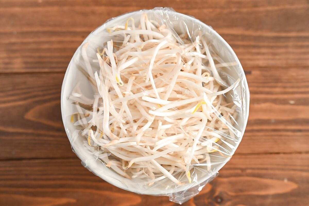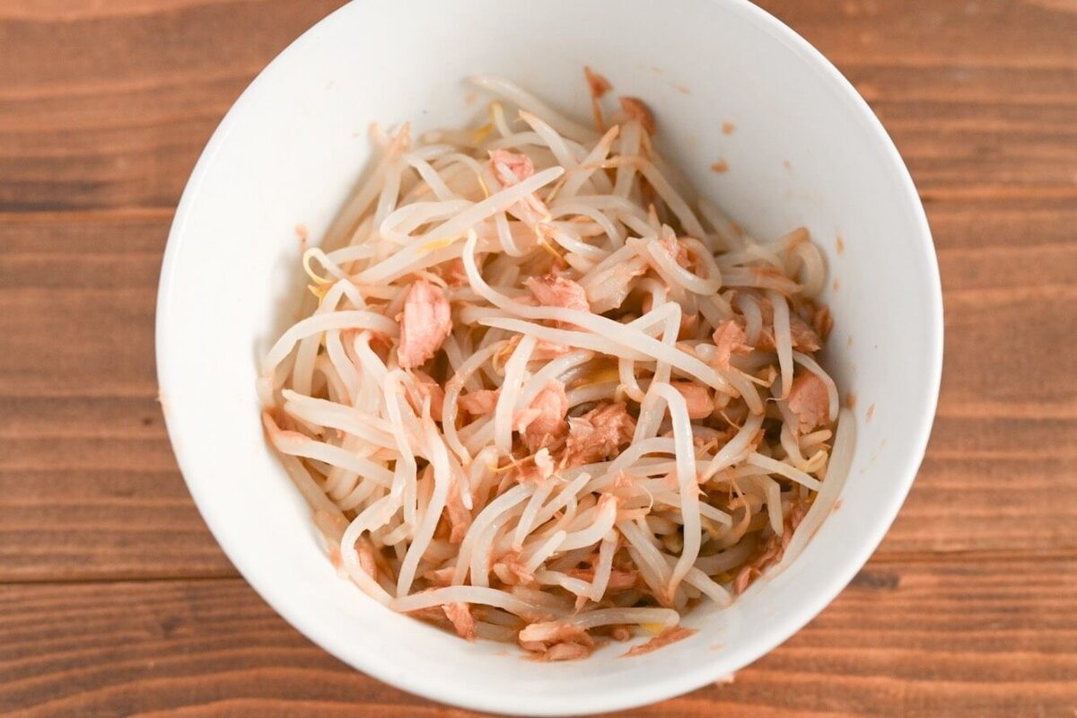 もやしを電子レンジ加熱している間に混ぜておくのがおすすめですよ。