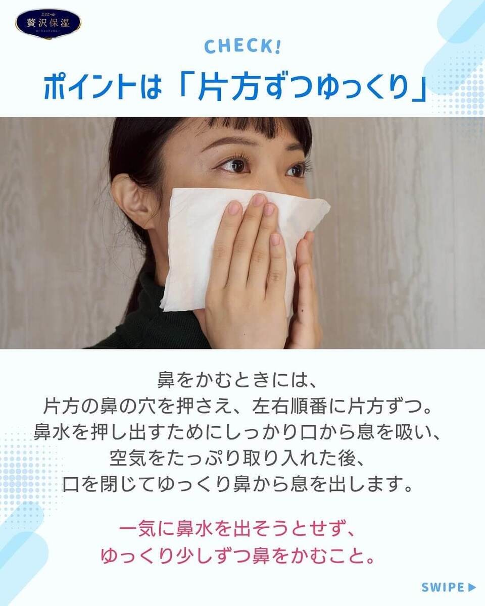 このとき、一気に鼻水を出そうとせず、ゆっくり少しずつ鼻をかむことを心がけてみてくださいね!