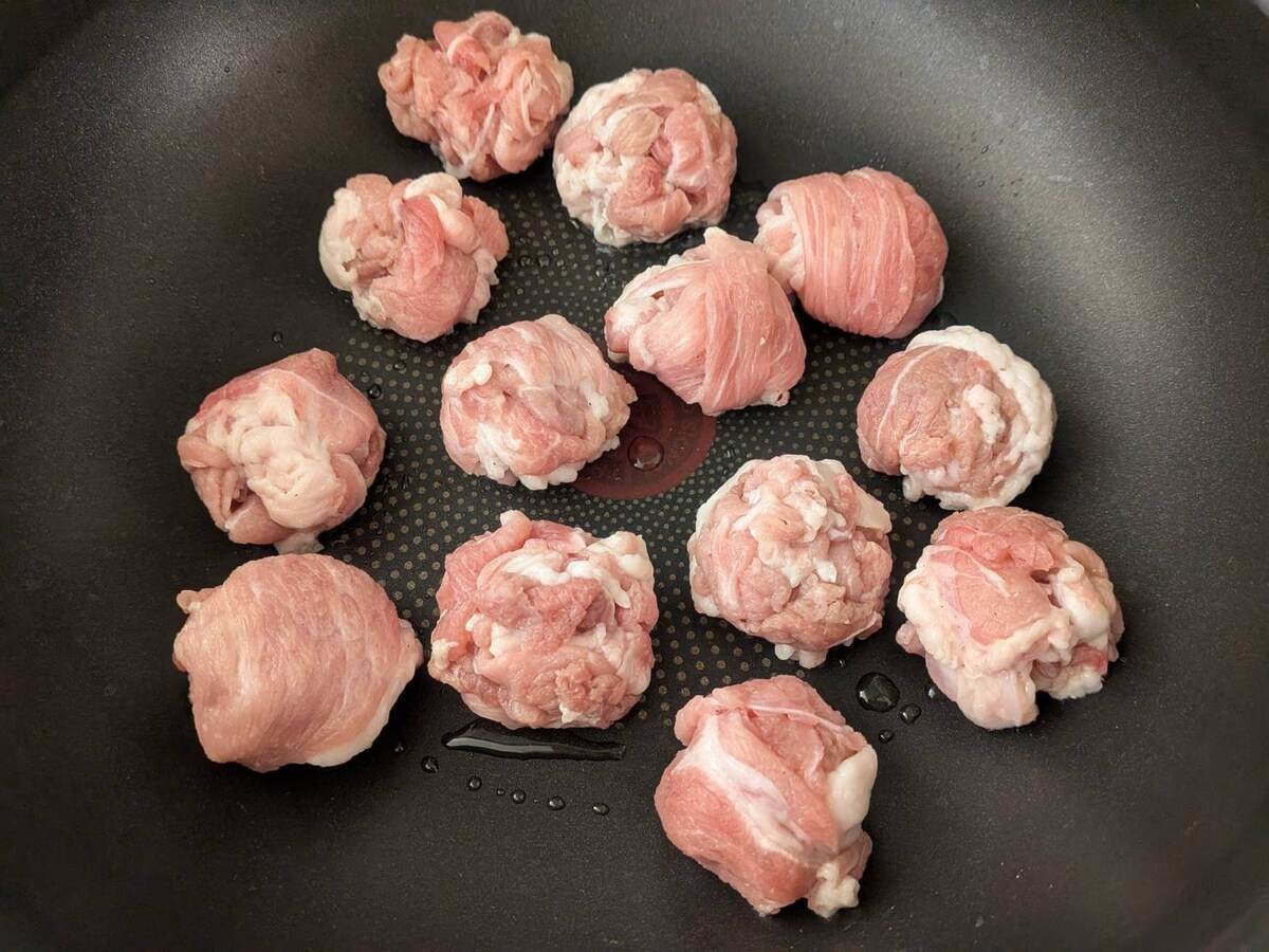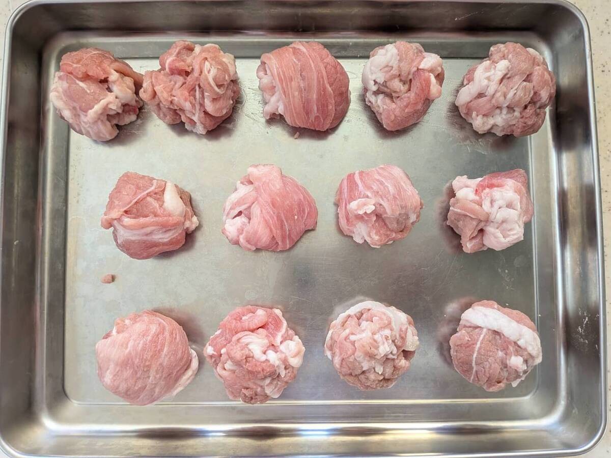 豚こま肉をばらけないようにぎゅっと握って一口大のボール状に丸め、これを12個分作ります。
