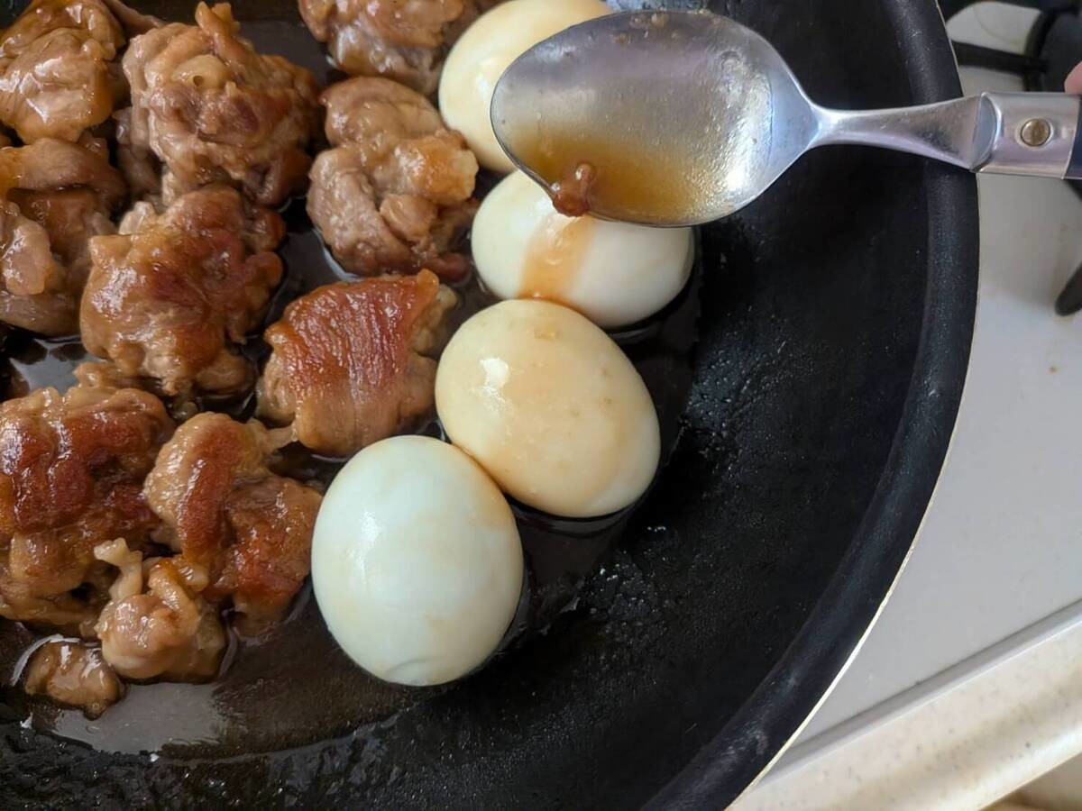 ⑤にゆで卵を加えてスプーンなどで、たれをかけてなじませたら完成です!