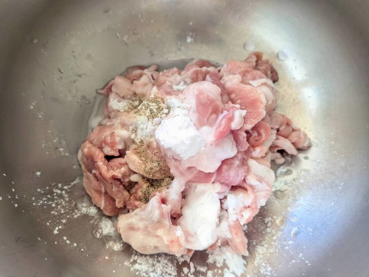 長さをととのえた豚こま肉をボウルに入れたら【A】を加えて混ぜ合わせます。