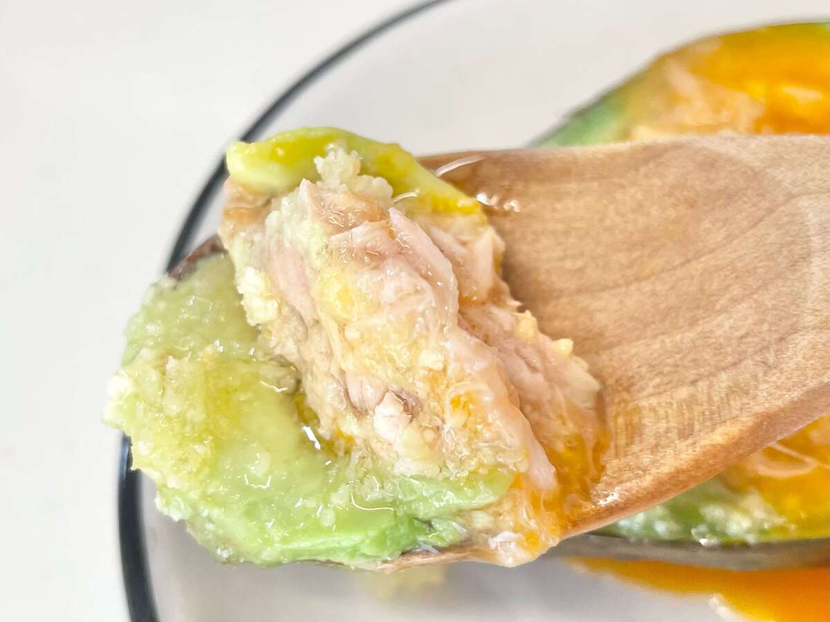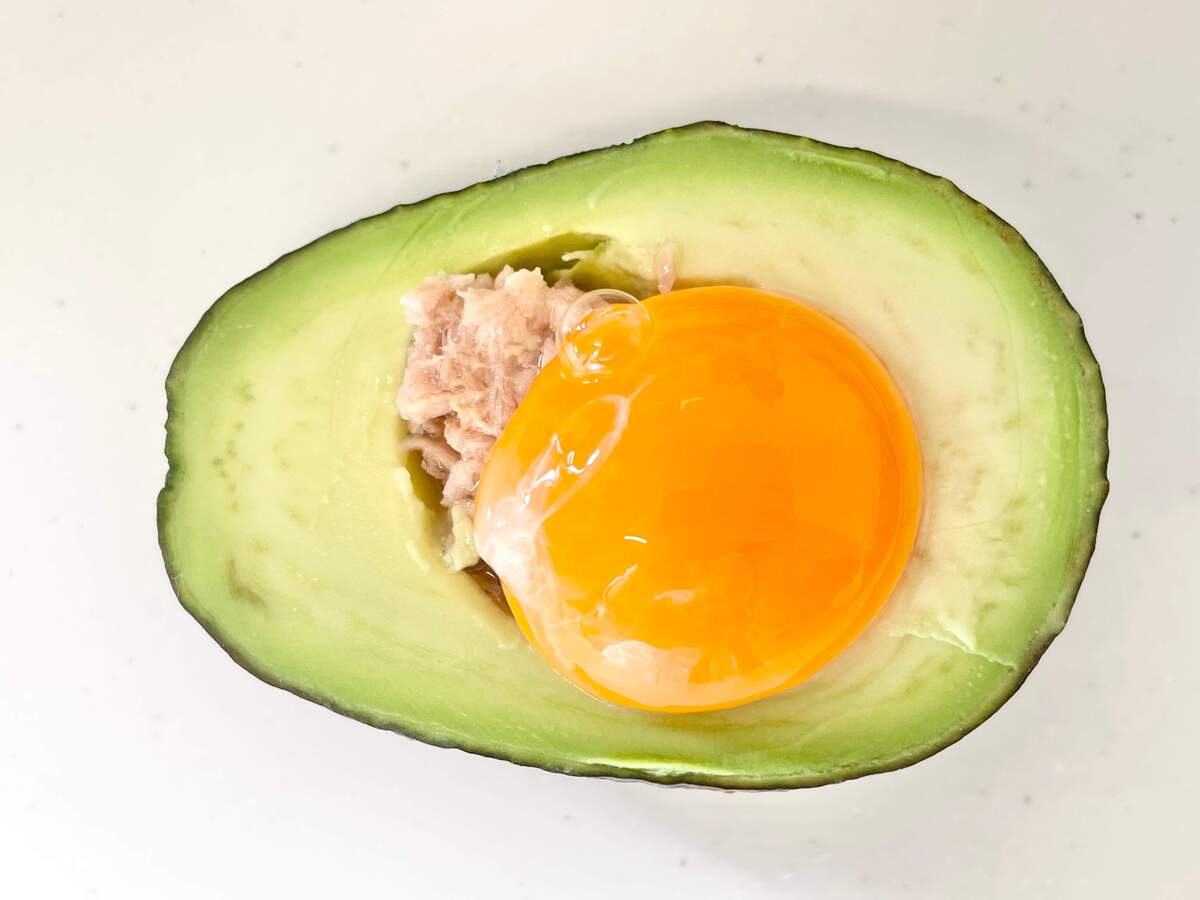 次にアボカドのくぼみにツナ缶と卵黄を入れます。