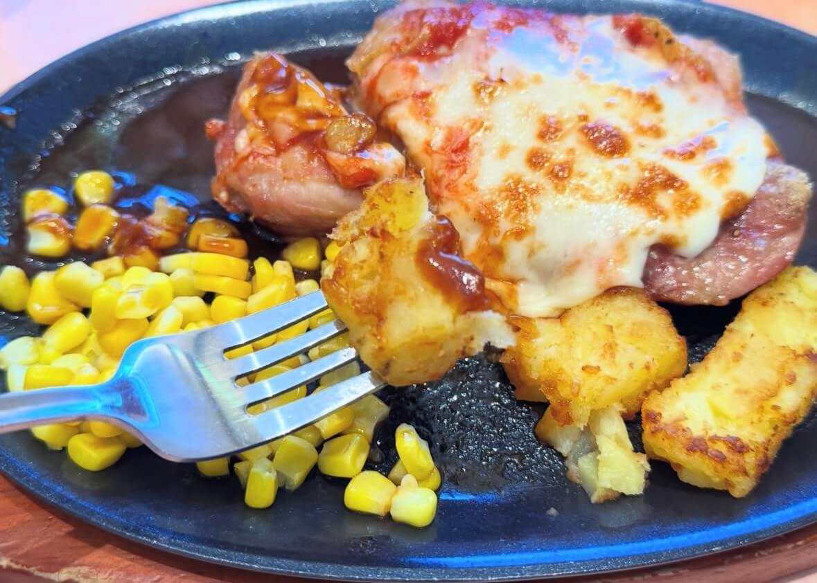 熱々の鉄板の上でジュワ~ッと焼ける音も贅沢。お肉と一緒にがっつり食べたい方は、パンやごはんを追加しても◎。