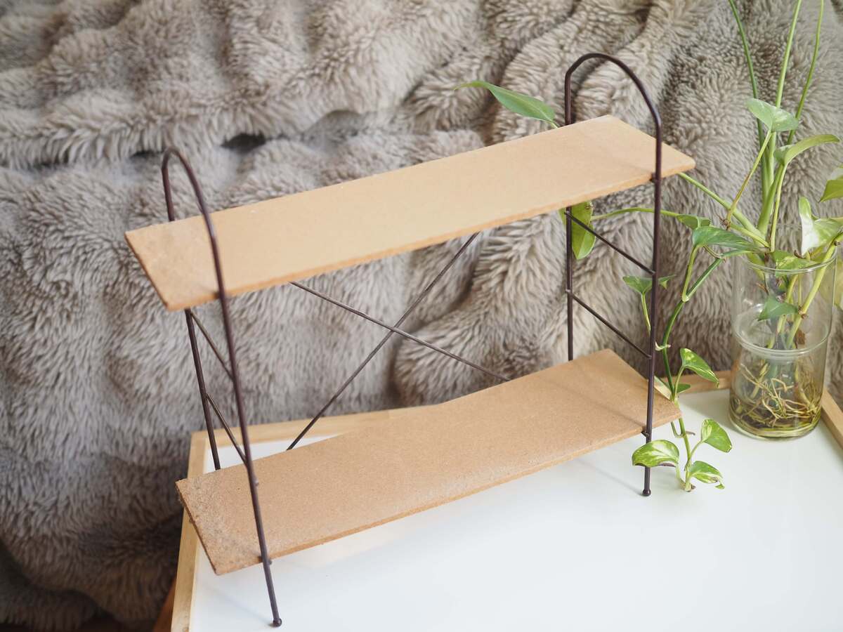 広げて2枚の横板をのせるだけで手軽に組み立てられて、スパイスや調味料などを並べて置くことができますよ。