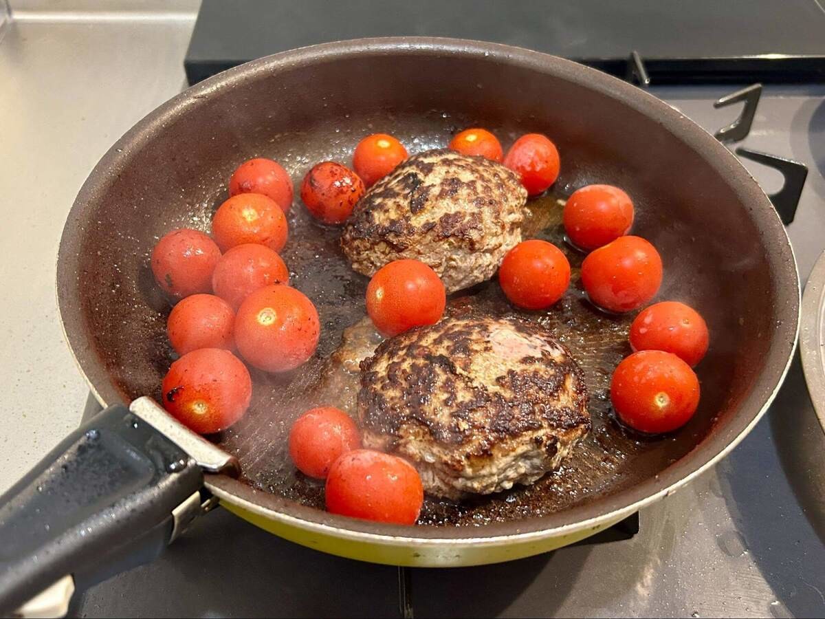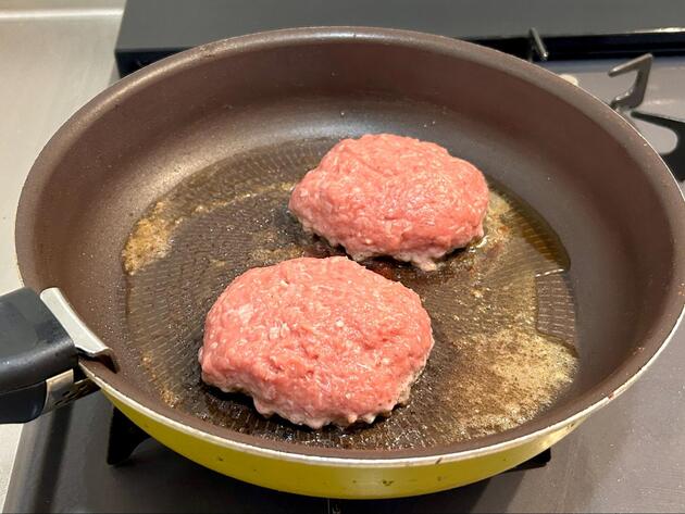 そこへ成形した肉だねを並べて3分焼き、裏返します。