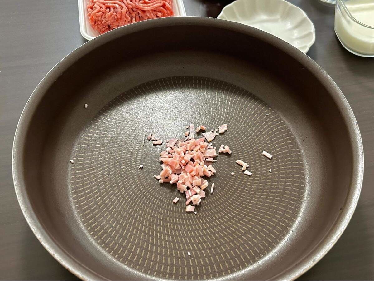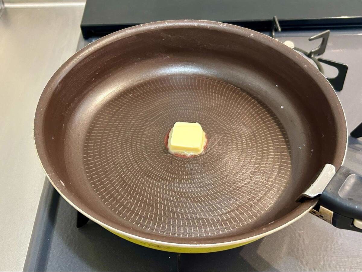 先ほどまで肉だね作りに使っていたフライパンをキッチンペーパーでふき、バターを入れて中火で溶かします。