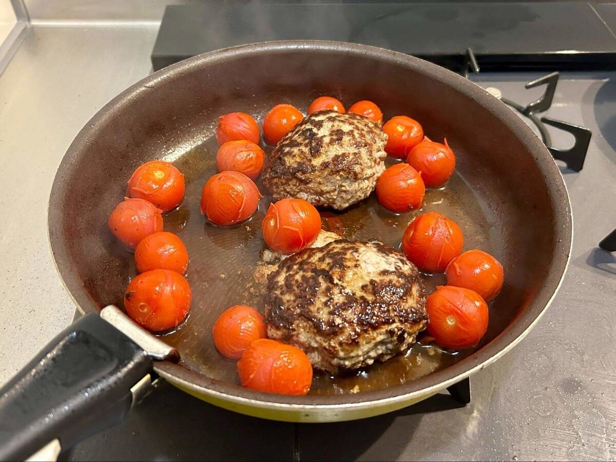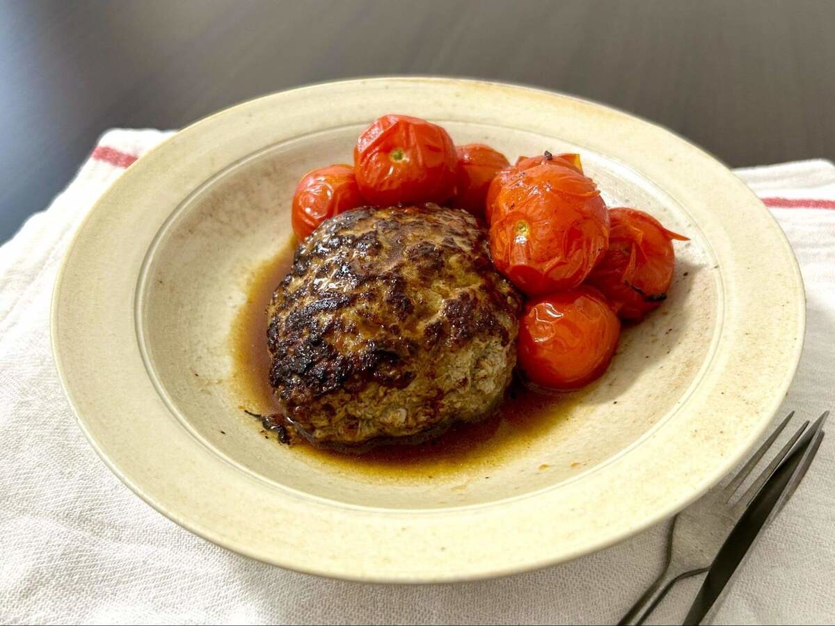 トマトの程よい酸味とやわらかな食感が、肉肉しいハンバーグを包み込み、バランスが取れた一皿に。