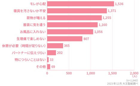 続いて、「お風呂に入れない」「生理痛で楽しめない」などの回答が上がり、中には「パートナーに伝えづらい」という回答もありました。