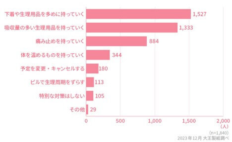 旅行と生理が重なりそうなときの対策として多かったのは、「下着や生理用品を多めに持っていく」「吸収量の多い生理用品を持っていく」という回答でした。生理用品をこまめに交換したり、普段より吸収量の多いものを使用したりすることで、モレ対策を行っている人が多いようです。