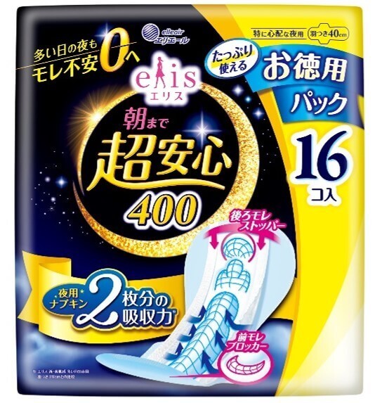 寝ているあいだのモレが心配なら、たっぷり吸収の「エリス 朝まで超安心」シリーズがおすすめです。特に「エリス 朝まで超安心 400(特に心配な夜用)羽つき 40cm」は、夜用ナプキン2枚分※の吸収力があるだけでなく、後ろモレはもちろん、前モレ&横モレもガード。多い日でも朝まで気にせずに寝ることができます。経血をぐっと引き込む表面シートだから、肌ざわりもさらさらをキープします。