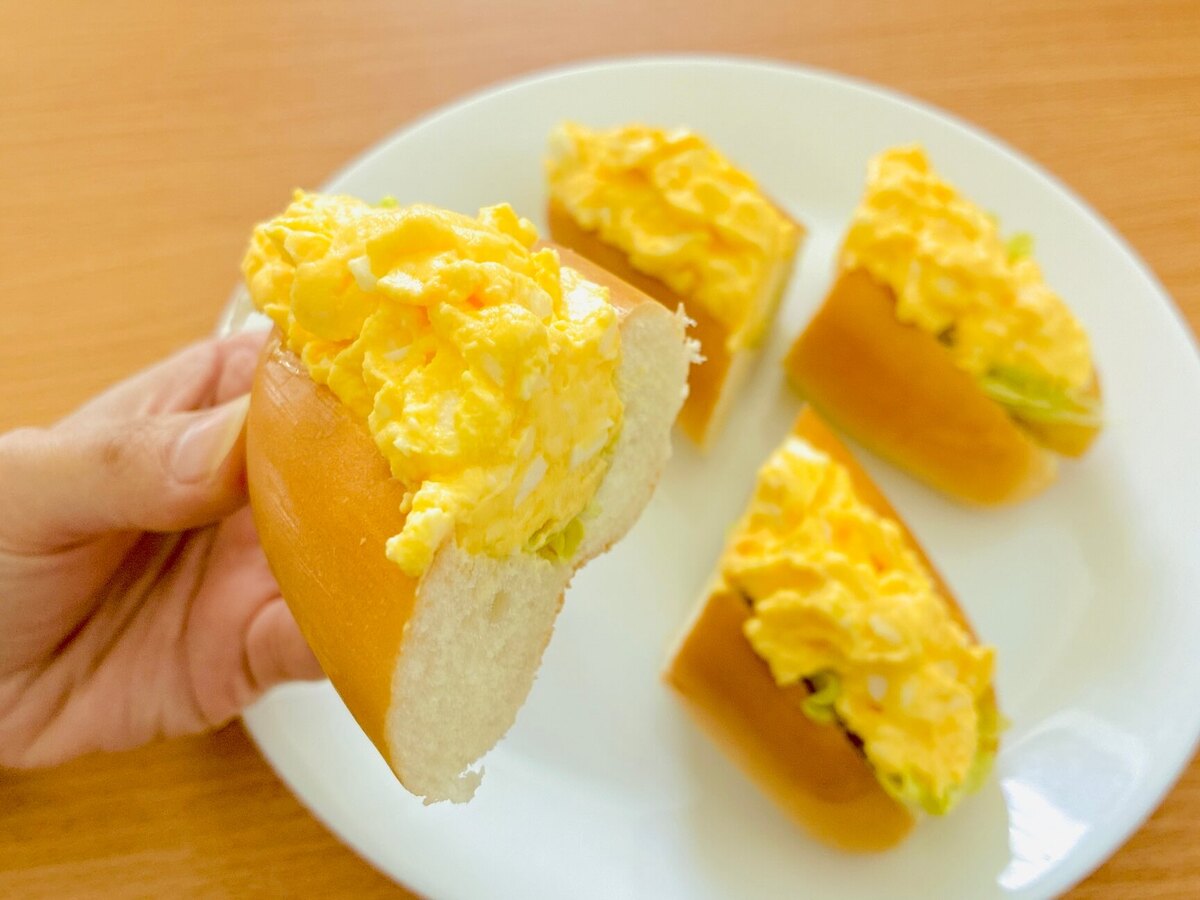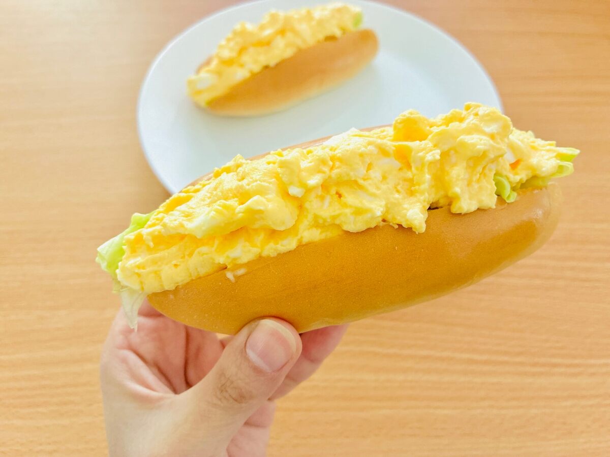 1本のホットドッグロールに、1袋のふんわりとした食感のたまごサラダ80gを贅沢に挟もうではないか!
