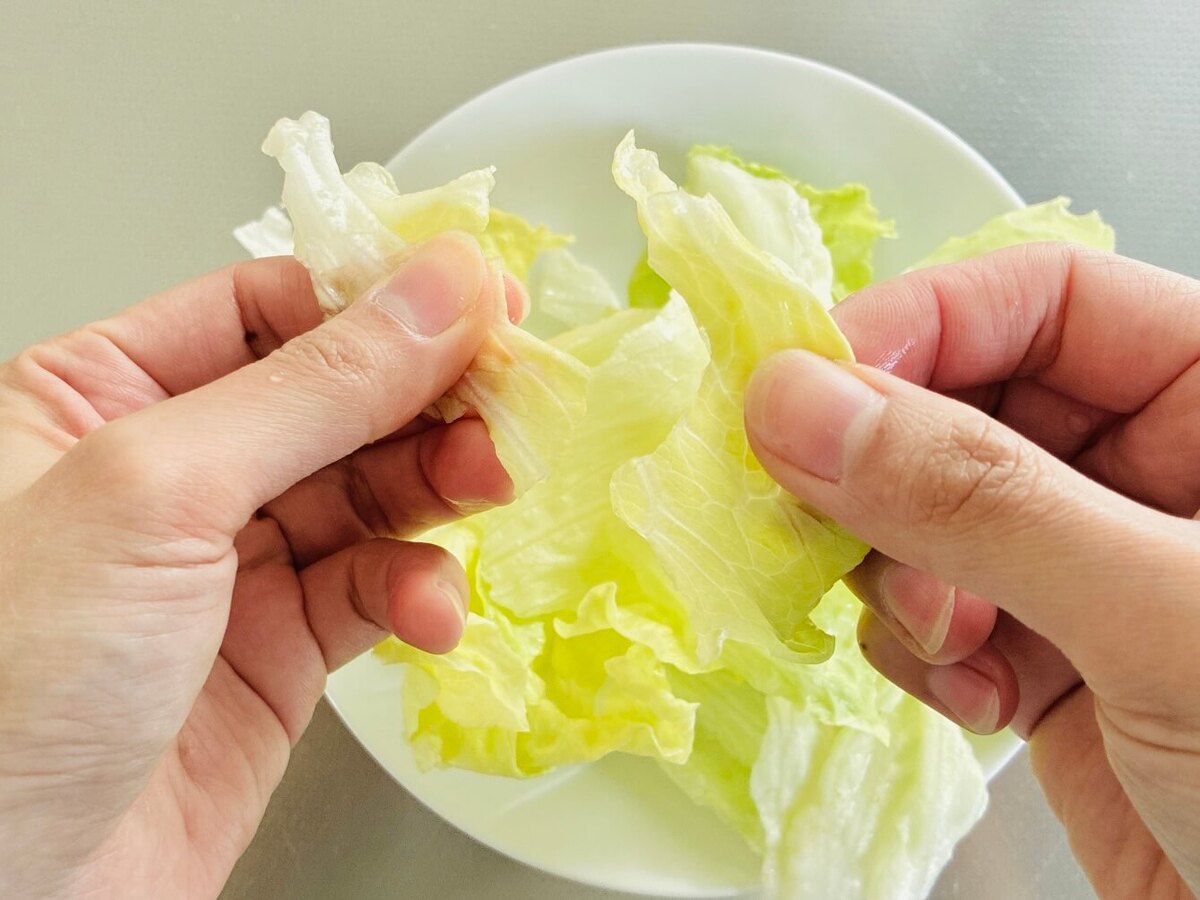その間に、レタスを適当な大きさに手でちぎりましょう!