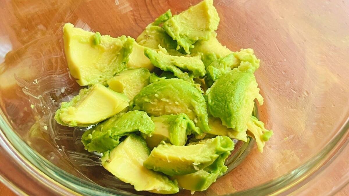 種を取り除いたアボカドを、食べやすい大きさになるよう皮からくり抜きながら、ボウルに移します。