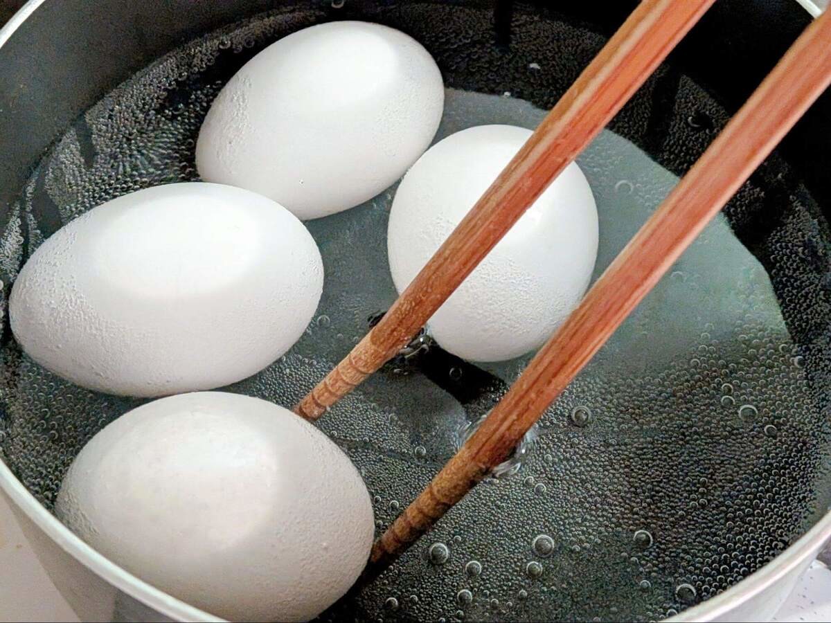 黄身が中央にくるよう、沸騰するまで菜箸で転がして上下をひっくり返すように動かします。沸騰したら弱火にし、4分ゆでて冷水にとりましょう。