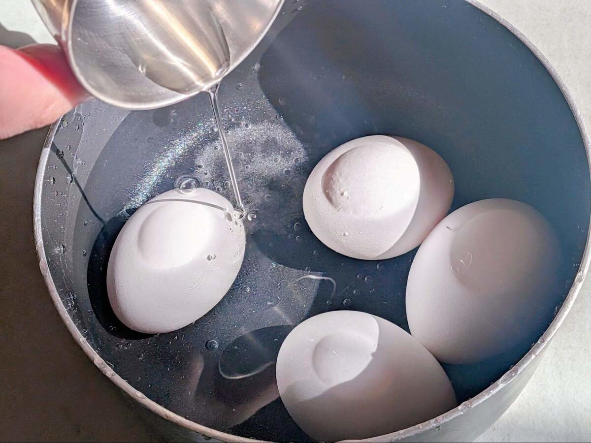 卵は常温に戻しておきましょう。直径16~18cmの鍋に、卵と卵がかぶるくらいの水(分量外)、酢、塩を入れて中火にかけてください。
