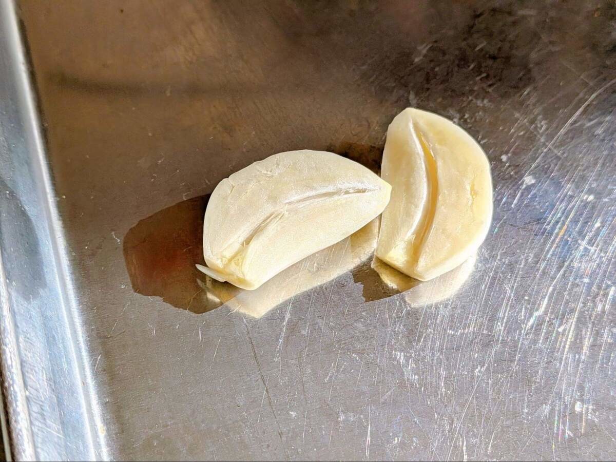 にんにくは皮を剥き半分にカットしたら、芯を取り除きます。