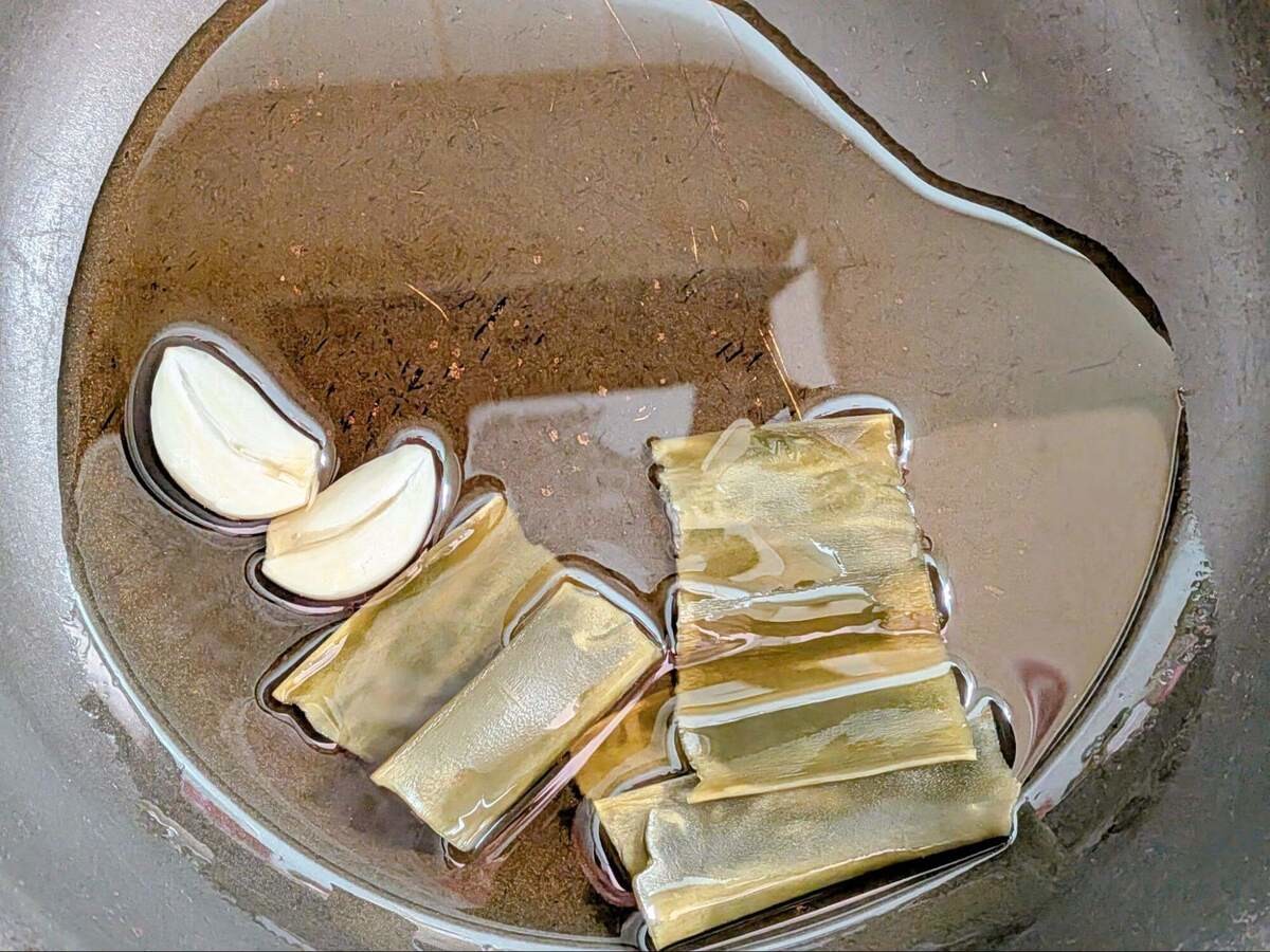 作り方④にんにくと昆布の香りを移す