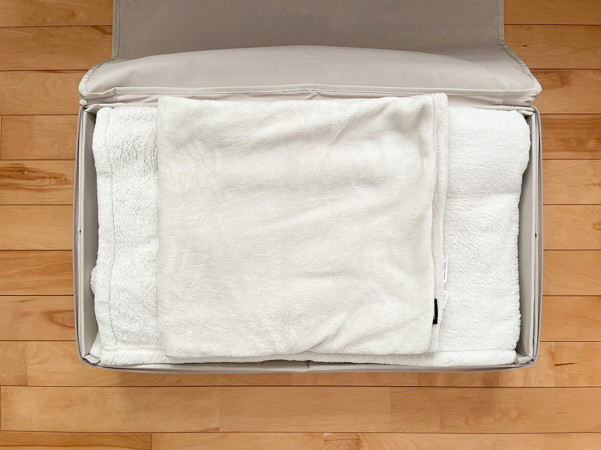 季節外れのブランケットやマイクロファイバー毛布を収納するのもおすすめ。