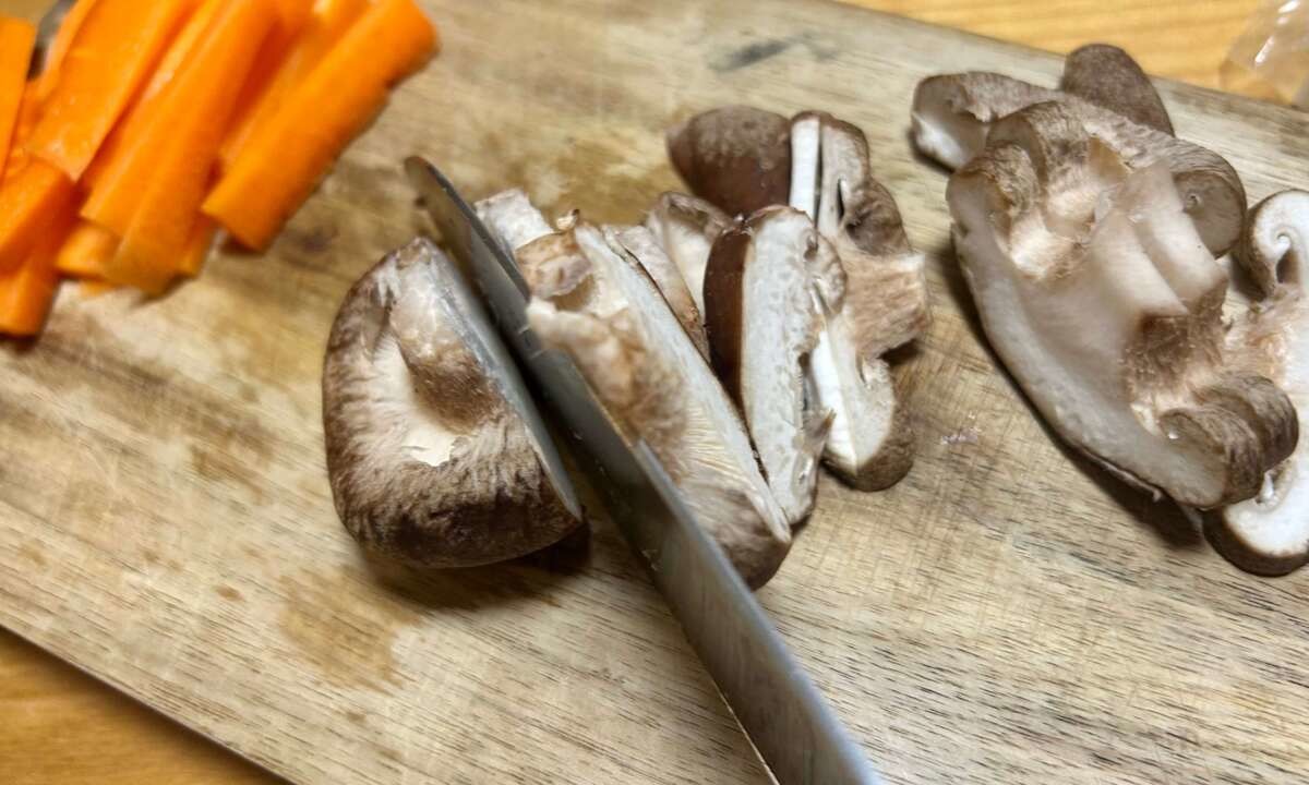 生しいたけは軸を切って薄切りに、にんじんは皮をむいて太めのせん切りにします。