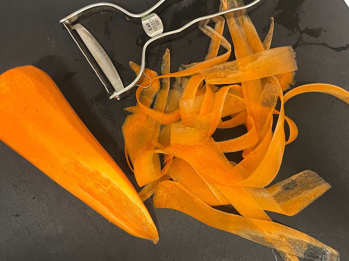 はじめににんじんは皮を剥き、ピーラーで薄くスライスします。