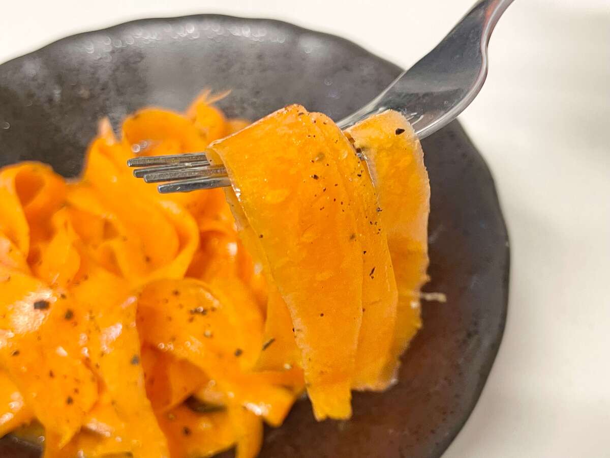 生だとかたそうなイメージがありましたが、薄くスライスしたにんじんは想像以上にやわらかく、シャキッとした歯切れのいい食感でした。
