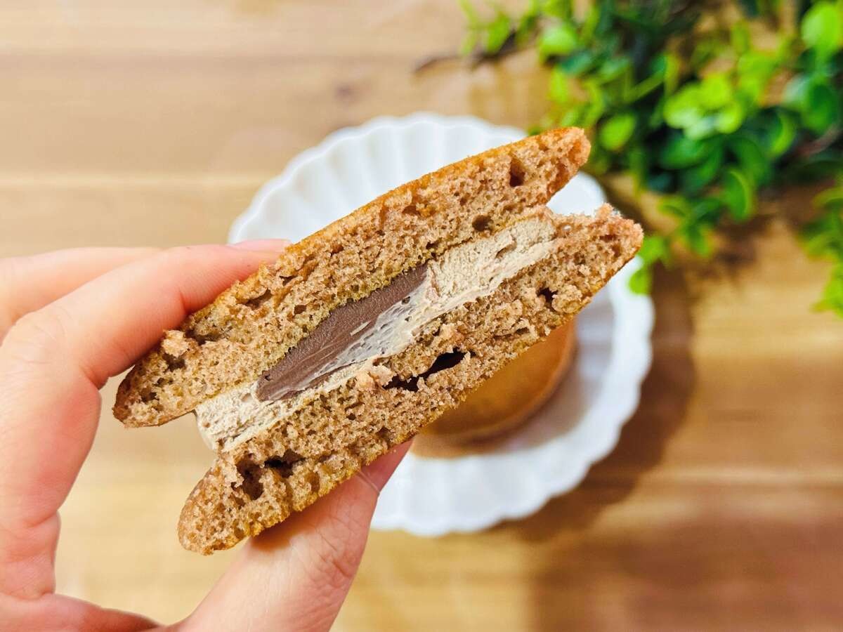 冷蔵庫で冷やしていたからか、中身は固めのチョコソースとチョコホイップ。 見た目はまるで生チョコが入ってるかのようですが、口の中ではなめらかですぐにくちどけていきます。