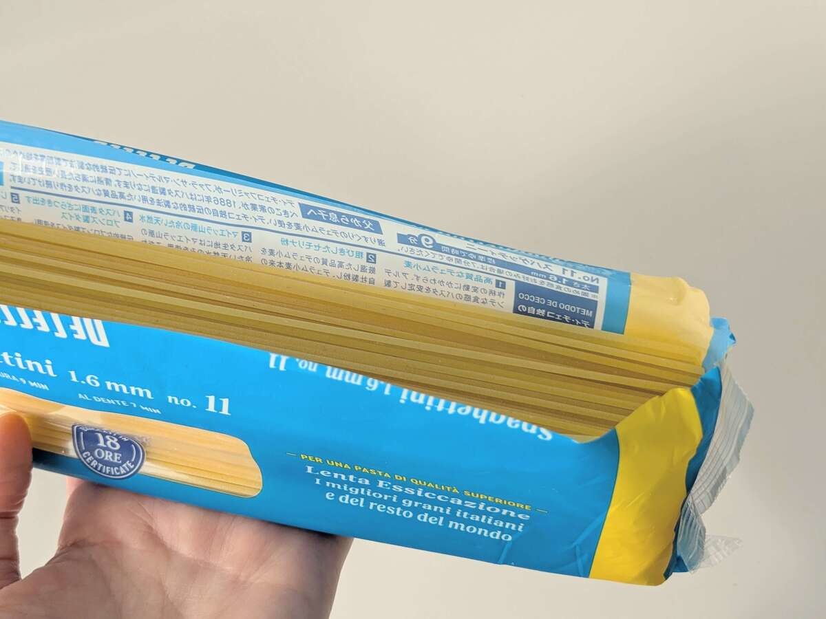 パスタに限らず乾麺の封を開けるとき、こんな風に袋の短い辺をカットしていませんか?