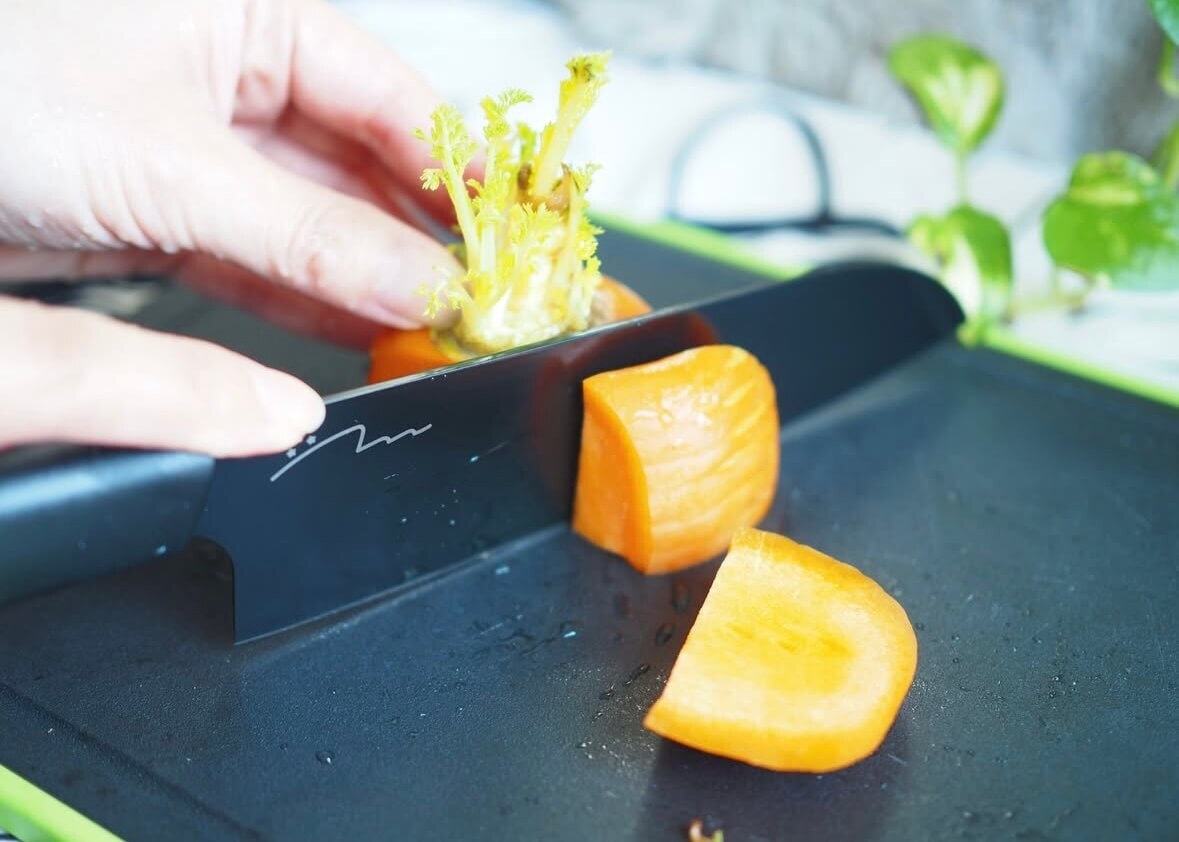 三徳包丁と同じくオールブラックのおしゃれな刀身で、シリーズで揃えるとキッチンがよりスタイリッシュな印象になりますね♪
