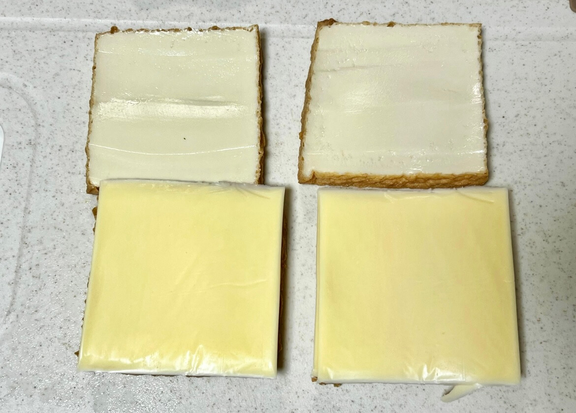 その厚揚げの中には、これでもか〜!と4枚入れたスライスチーズが贅沢に登場……!