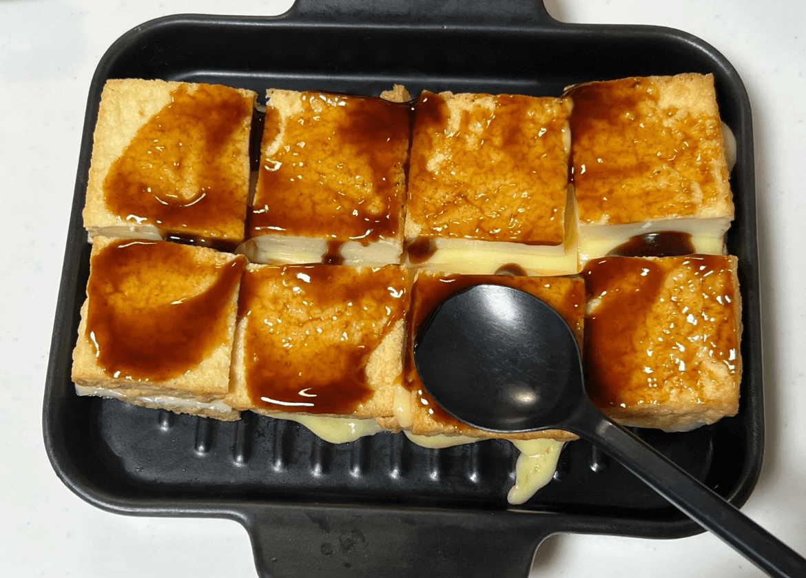温めた厚揚げにソースの半量(大さじ1.5)をかけて、予熱しておいたトースターで表面がカリッとするまで焼きます。