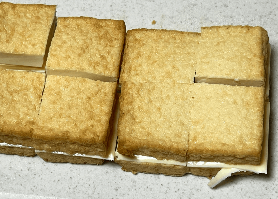 半分に切れたら、スライスチーズを2枚重ねて真ん中に挟みます。