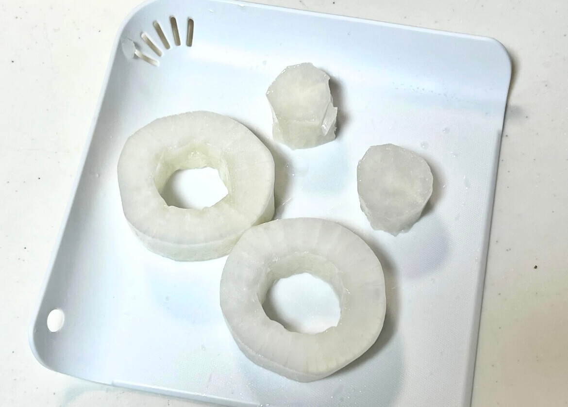 輪切りにした大根の真ん中を型抜きでくり抜き、輪っか状にします。