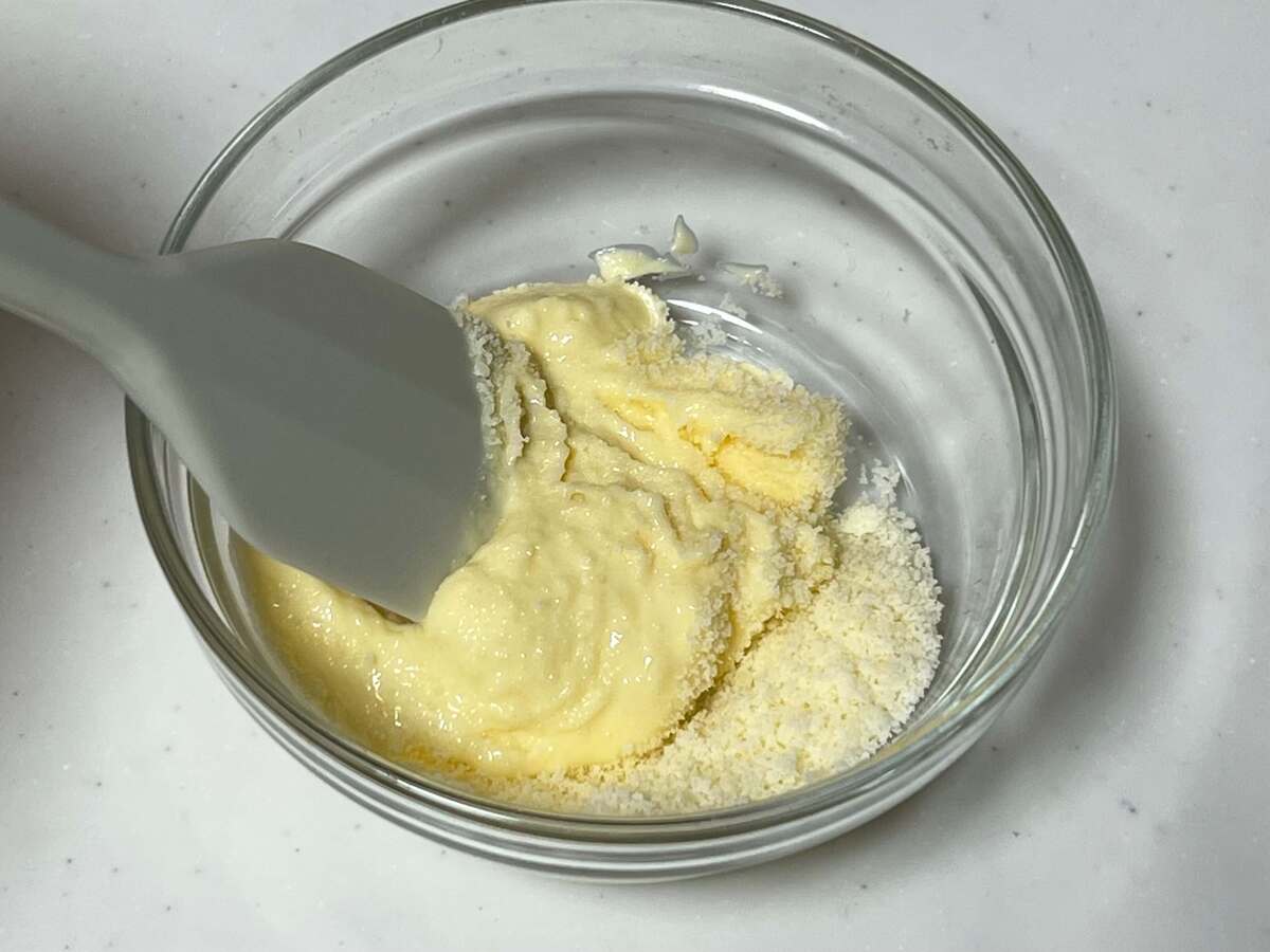 常温に戻したバターに粉チーズを混ぜて、ペースト状にしておきます。
