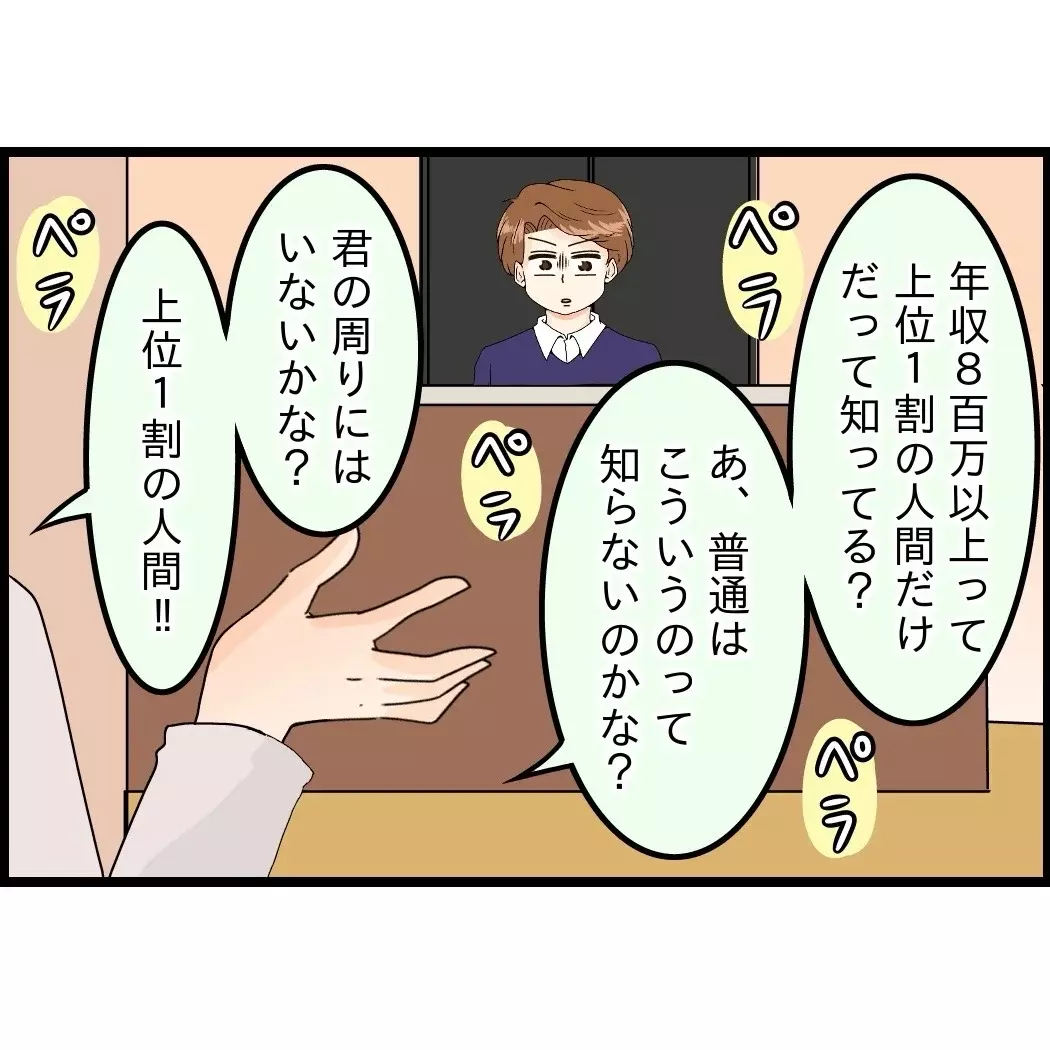 ふとしたきっかけで、義兄から「自分は普通よりだいぶ上の人間」という台詞が飛び出しました。そこから出るわ出るわ……「だって僕…年収800万だよ(ニヤッ)」「上位2割の人間」など、ドヤ顔での“とんでも発言”のオンパレード!