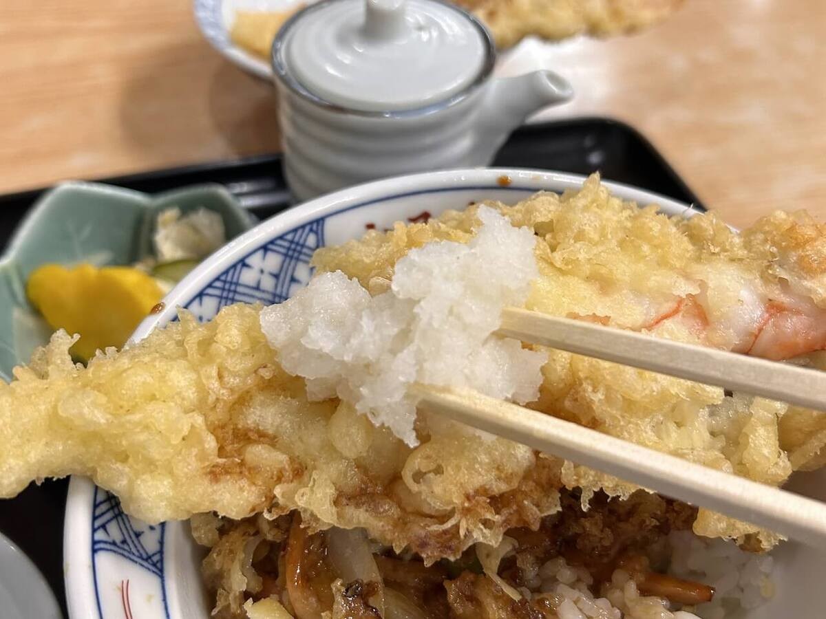 二段構えの満足感:3本のエビ天の下には、さらに「かき揚げ」が隠れています。甘辛い出汁の効いたタレが染みたご飯との相性は抜群です。