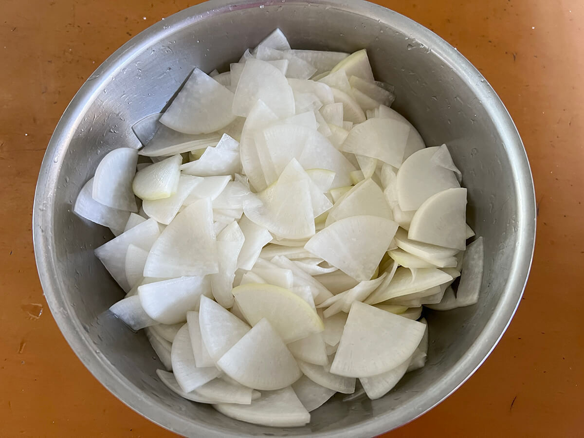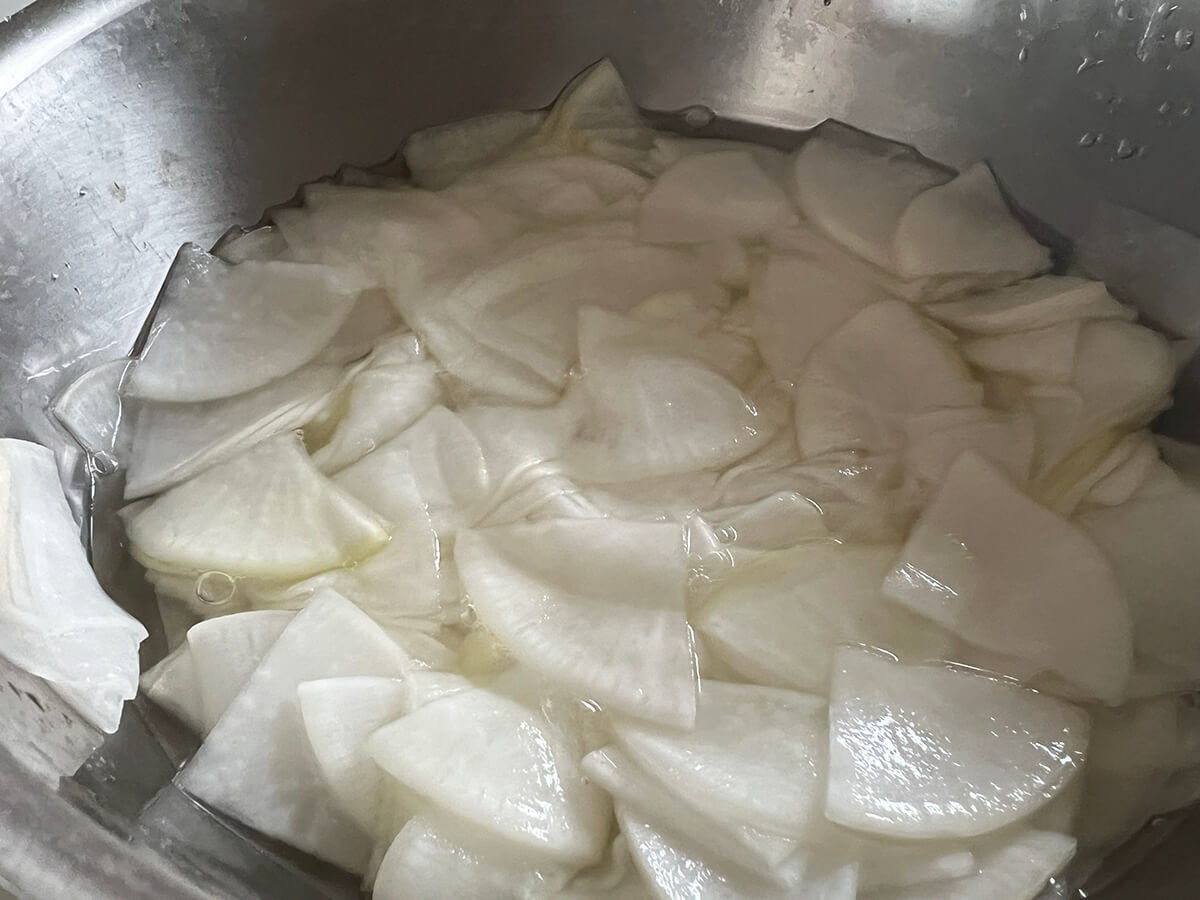 作り方①大根を切り、塩をして、重しをしてひと晩おく