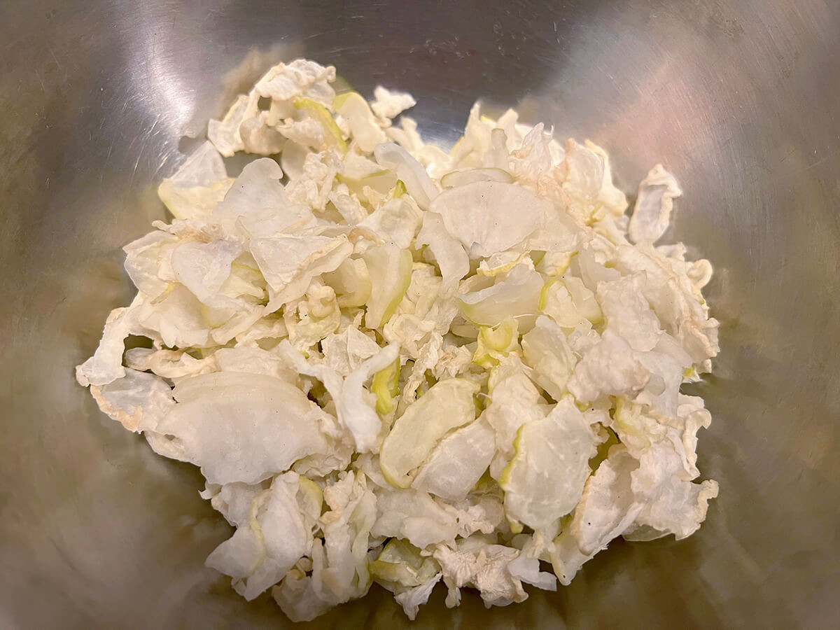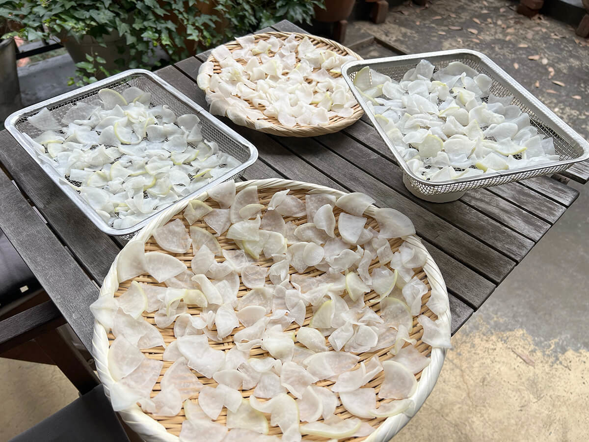この水分が全部あの大根から出たのですねぇ。次の工程としては、この水けをしっかりと絞り、ざるに広げ、天日で約6時間干し、水分を抜いてカラカラの状態にするのだそうです。