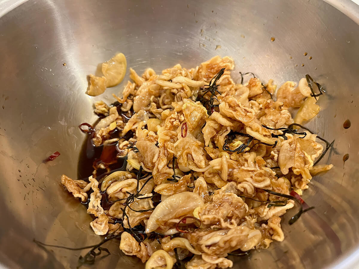 【A】を加えて混ぜ合わせます。赤とうがらしを半分に切って種を除き、小口切りにして加え、ざっと混ぜましょう。