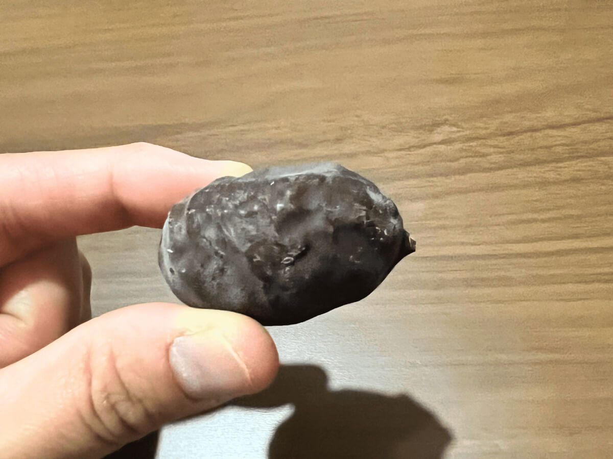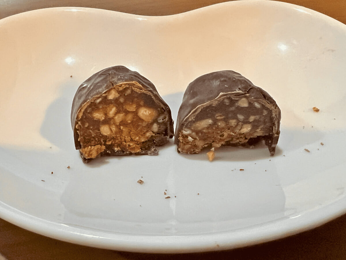 ペースト状にしたデーツにオレンジピールやナッツを加え、それをチョコレートでコーティングしたスイーツ。 手に取ると重さがあり、ぎっちり濃厚感が手から伝わってきます。